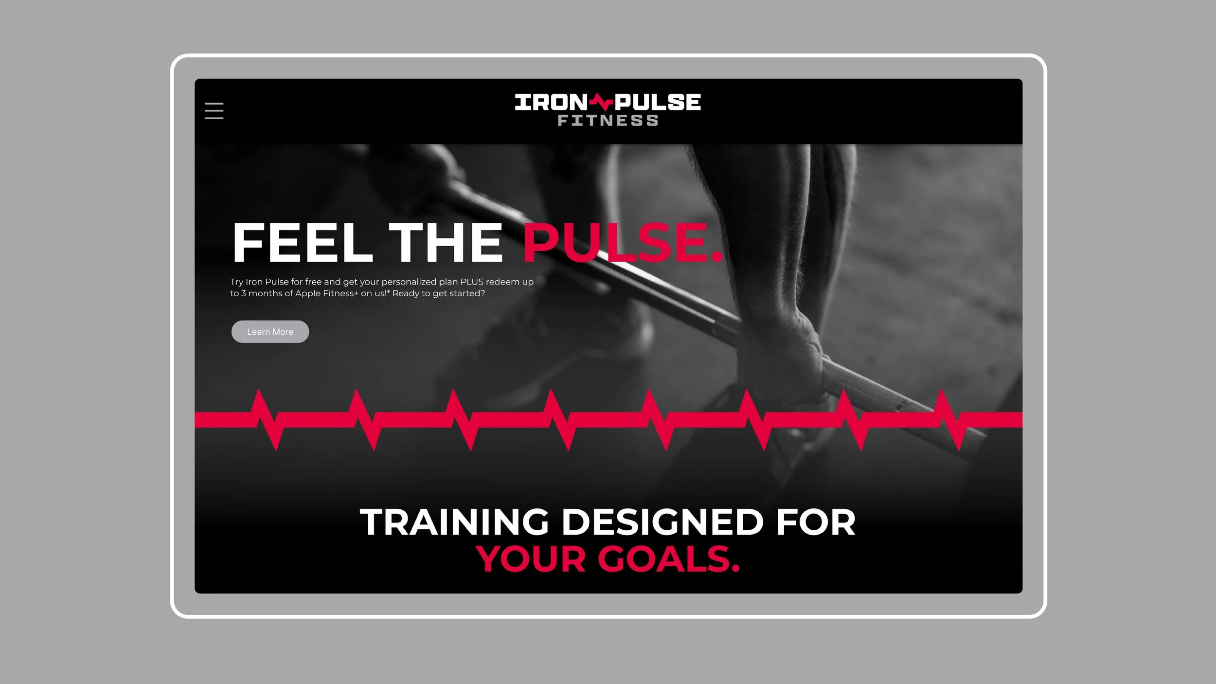 Iron Pulse Fitness is a fictional modern gym chain focused on strength training, personal coaching, and high-intensity group classes. With the design my focus was to create a bold and energetic brand that motives clients to keep reaching for their fitness goals.